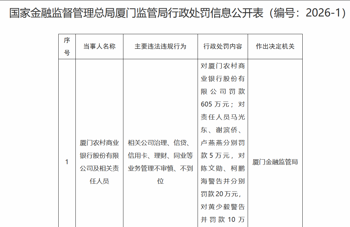 2月14日,国家金融监督管理总局厦门监管局披露2026年1号行政处罚决定,厦门农村商业银行股份有限公司(以下简称"厦门农商行")因多项业务管理存在严重漏洞,被处以605万元罚款,创下该行近年来单张罚单金额新高。同时,8名相关责任人被追责,合计罚款60万元并处以警告。