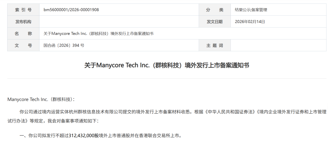 2月14日,中国证监会官网披露《关于Manycore Tech Inc.(群核科技)境外发行上市备案通知书》(以下简称《备案通知书》)。