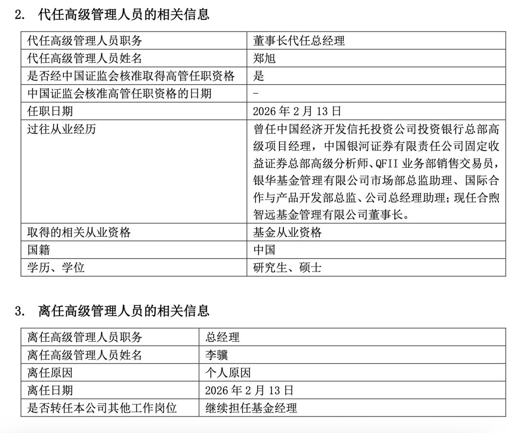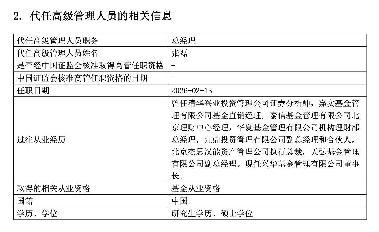 其中,兴华基金原总经理韩光华因个人原因于2月13日离任,公司董事长张磊代任总经理一职;合煦智远基金原总经理李骥因个人原因离任后,继续留在公司担任基金经理,由董事长郑旭代任总经理。