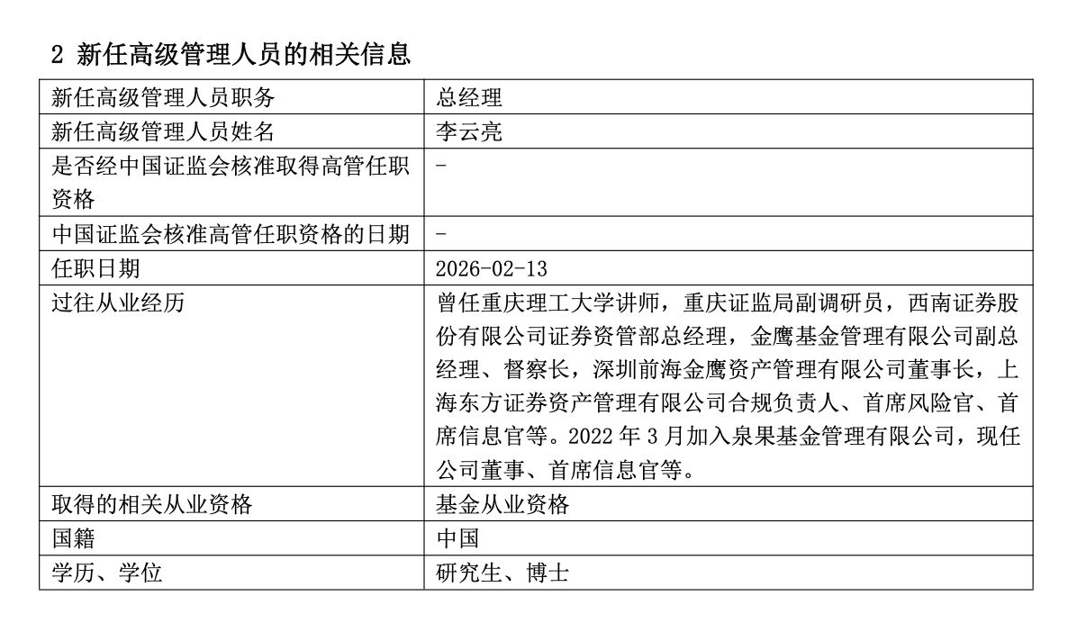 同时,泉果基金还新任了财务负责人姜荷泽,副总经理姚钟骁,合规负责人、风控负责人孙媛等。