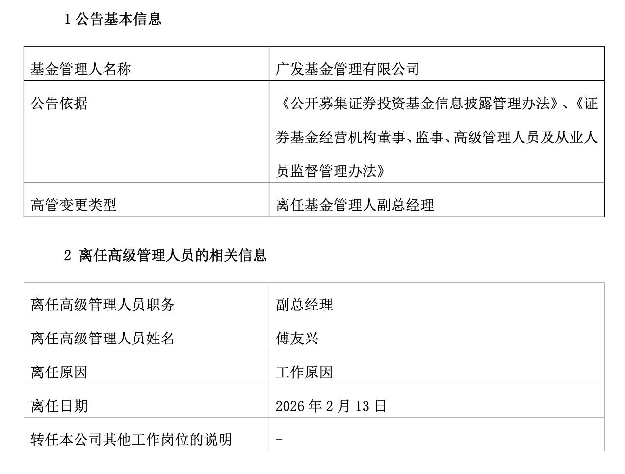 例如,广发基金公告显示,该公司副总经理、联席投资总监傅友兴因工作原因于2月13日卸任公司副总职务。傅友兴是业内知名的基金经理,有超过13年的基金管理经验,根据Wind数据,他目前仍有在管产品2只,管理规模102.76亿元。