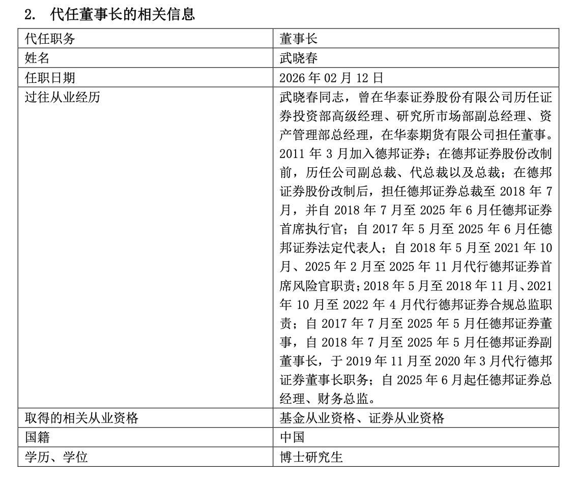 以德邦基金为例,公告显示,该公司董事长左畅因工作调整于2月12日离任,由武晓春代任董事长职务。履历显示,武晓春曾在华泰证券历任证券投资部高级经理、研究所市场部副总经理、资产管理部总经理,在华泰期货担任董事;2011年3月加入德邦证券,自2025年6月起任德邦证券总经理、财务总监。
