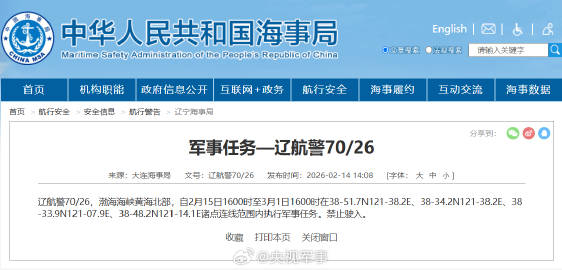 据中国海事局网站消息,大连海事局发布航行警告,2月15日16时至3月1日16时,渤海海峡黄海北部部分海域执行军事任务,禁止驶入。
