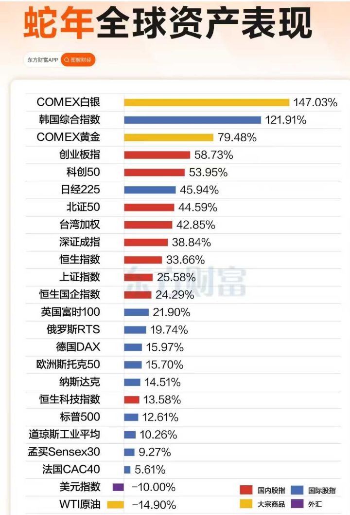 回顾蛇年全球市场,整体呈现“东升西降”格局,A股表现不俗,创业板、科创50、北证50等指数蛇年的累计涨幅高居全球前列。