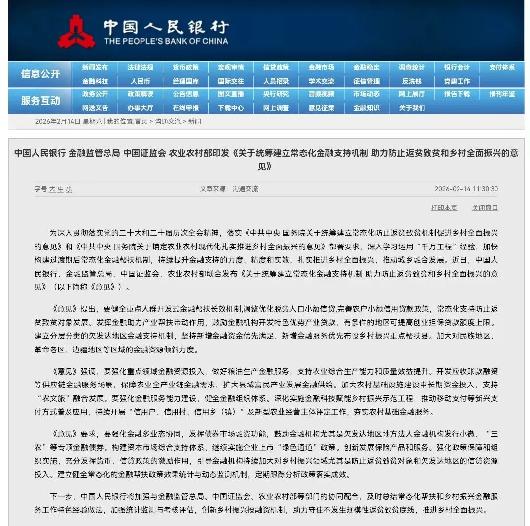 中国人民银行2月14日消息,为深入贯彻落实党的二十大和二十届历次全会精神,落实《中共中央国务院关于统筹建立常态化防止返贫致贫机制促进乡村全面振兴的意见》和《中共中央国务院关于锚定农业农村现代化扎实推进乡村全面振兴的意见》部署要求,深入学习运用“千万工程”经验,加快构建过渡期后常态化金融帮扶机制,持续提升金融支持的力度、精度和实效,扎实推进乡村全面振兴,推动城乡融合发展。近日,中国人民银行、金融监管总局、中国证监会、农业农村部联合发布《关于统筹建立常态化金融支持机制助力防止返贫致贫和乡村全面振兴的意见》(以下简称《意见》)。