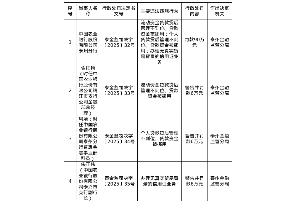 此外,中国农业银行股份有限公司靖江市支行公司金融部总经理谢红艳、中国农业银行股份有限公司泰州分行普惠金融事业部科员周清、中国农业银行股份有限公司泰兴市支行副行长朱正伟,分别被警告并处以6万元罚款。