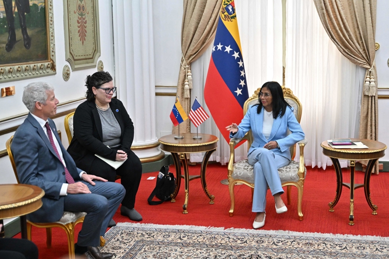 2月11日,在委内瑞拉加拉加斯,委内瑞拉代总统德尔西·罗德里格斯(右)与美国能源部长克里斯·赖特(左)交谈。 新华社