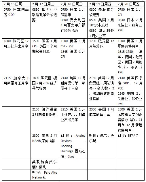 数据方面,投资者将重点关注20日公布的美国去年第四季度GDP初值和(去年)12月PCE通胀数据——这是美联储最看重的通胀指标。其他值得关注的数据包括:18日的1月工业产出;19日的12月贸易数据及初请失业金人数、20日2月密歇根大学消费者信心指数终值以及(去年)12月新屋销售等。