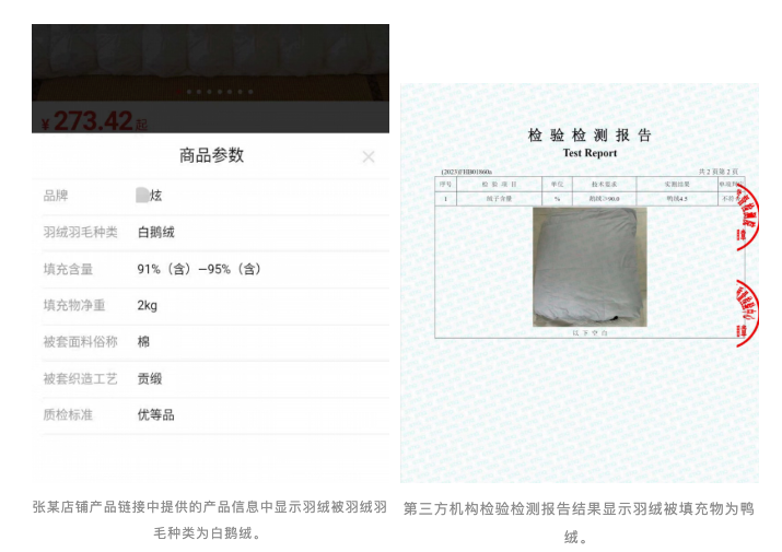 2023年5月,消费者小徐在张某的店铺购买了9条标称为“某炫”品牌的羽绒被,收货后发现被子既无商标,质量也堪忧。经第三方检测,案涉羽绒被的含绒量仅为4.5%(鸭绒),而非页面宣传的“白鹅绒”。2024年6月,小徐将张某诉至法院,最终双方达成和解,张某赔偿小徐2.2万元。