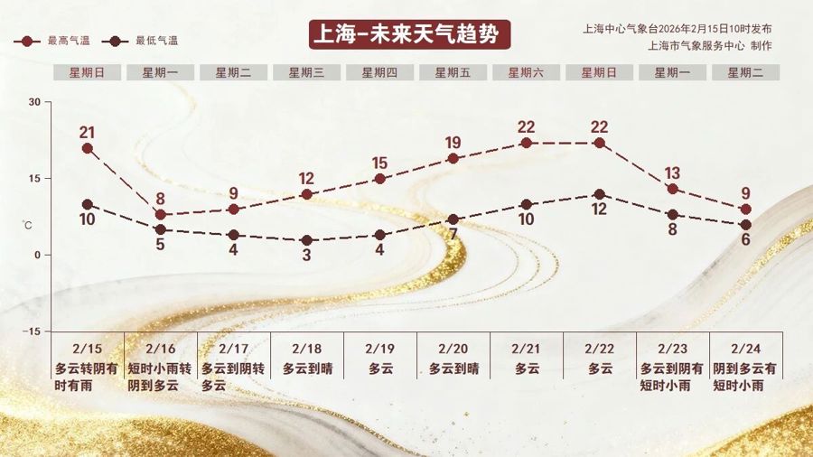 回暖已近尾声,马年新春的第一股冷空气今夜抵沪,冷暖交汇将带来小到中雨,主要降水时段出现在夜间,并可能伴有弱雷电。除夕上午雨水减弱,白天仍有短时小雨,全天气温骤降至5~8,体感湿冷。
