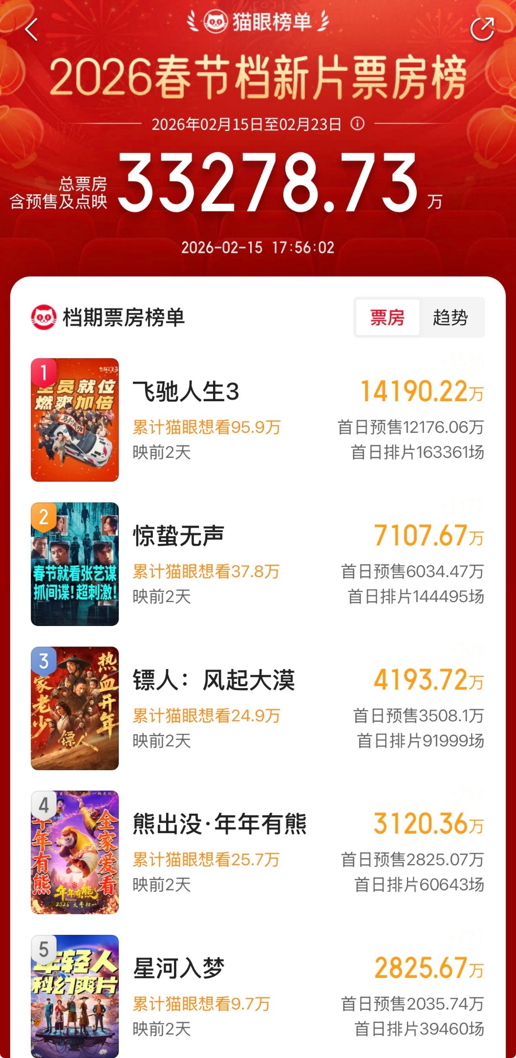 2月15日,随着农历新年脚步临近,中国电影市场迎来年度最重要档期。据猫眼专业版数据显示,截至今日17时56分,2026年春节档(2月15日至2月23日)新片预售总票房突破3.3亿元大关。在8部题材各异的影片中,韩寒执导、沈腾主演的《飞驰人生3》以超过1.4亿元的预售成绩领跑,张艺谋的首部国安题材影片《惊蛰无声》与袁和平的武侠动作片《镖人:风起大漠》分别以7107万元和4193万元的预售票房紧随其后。