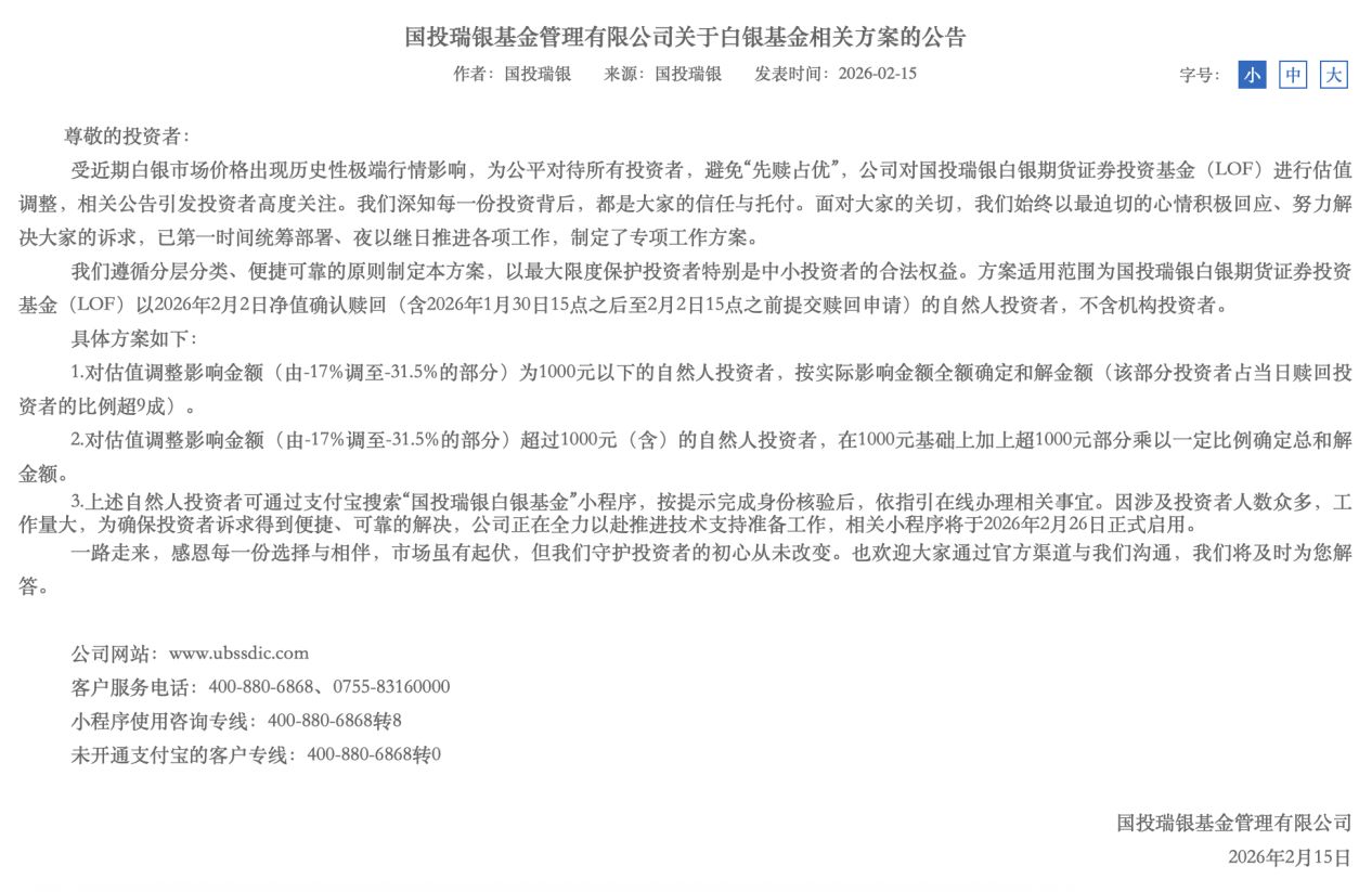 2月15日晚间,国投瑞银基金发布《关于白银基金相关方案的公告》,针对旗下国投瑞银白银期货证券投资基金(LOF)因白银市场历史性极端行情引发的估值调整事宜,推出专项工作方案。