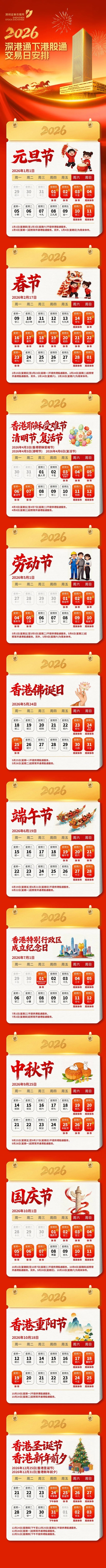 根据《深圳证券交易所深港通业务实施办法》有关规定和深圳证券交易所、香港联合交易所有限公司2026年的交易日安排,中国创盈市场服务有限公司现将2026年全年深港通下港股通交易日安排通知如下。