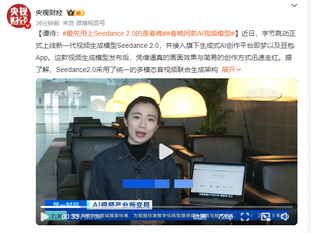 据央视财经报道,近日,字节跳动正式上线新一代视频生成模型Seedance 2.0,并接入旗下生成式AI创作平台即梦以及豆包App。这款视频生成模型发布后,凭借逼真的画面效果与简易的创作方式迅速走红。据了解,Seedance2.0采用了统一的多模态音视频联合生成架构,模型可以理解用户输入的内容,参考画面构图、镜头语言、动作节奏等元素来生成视频,让普通用户也能像导演一样,进行视频创作。火山引擎是字节跳动面向企业的云与AI服务平台,也是今年总台春晚独家AI云合作伙伴。火山引擎总裁谭待介绍,在Seedance2.0模型正式推出之前,就已经深度参与多个春晚节目的视觉制作环节,所以春晚也是这款模型的第一个客户。