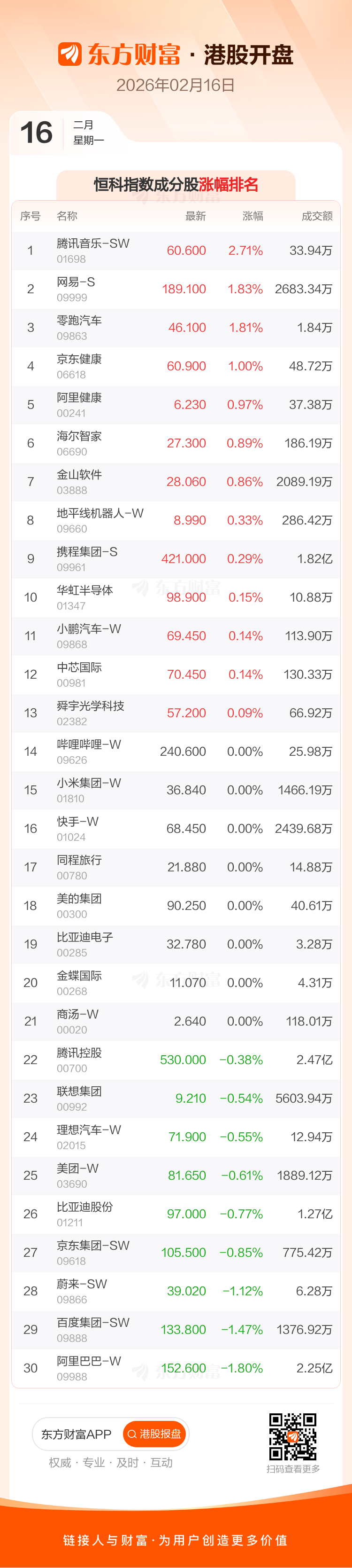 港股2月16日低开 ,恒生指数开盘报26501.2点,跌65.92点,跌幅0.25%;恒生科技指数开盘报5350.25点,跌10.17点,跌幅0.19%。恒生指数成分股中信义玻璃、网易-S、申洲国际涨幅居前,阿里巴巴-W、汇丰控股、百度集团-SW跌幅靠前。恒生科技指数成分股中腾讯音乐-SW、网易-S、零跑汽车涨幅居前,阿里巴巴-W、百度集团-SW、蔚来-SW跌幅靠前。