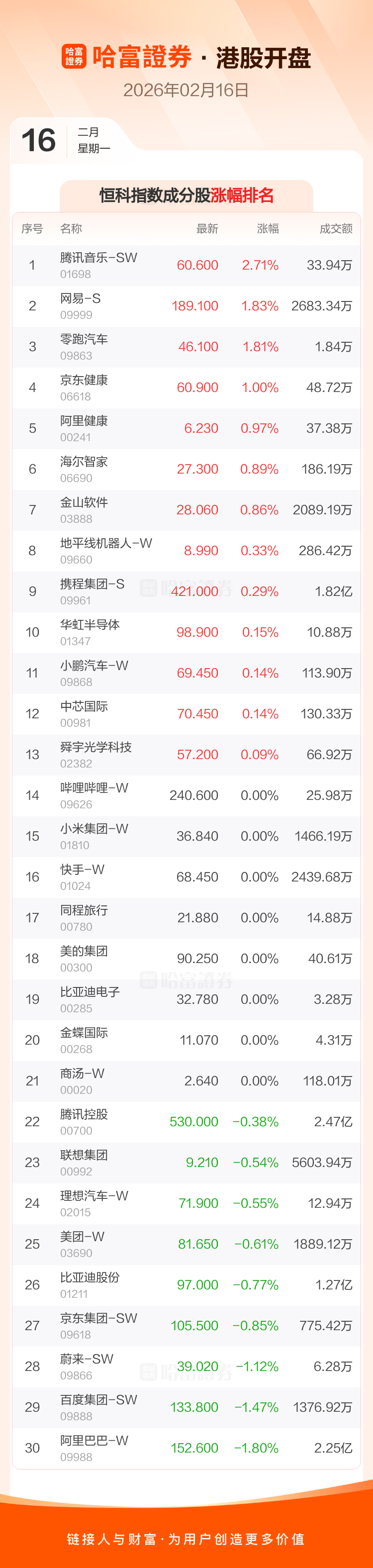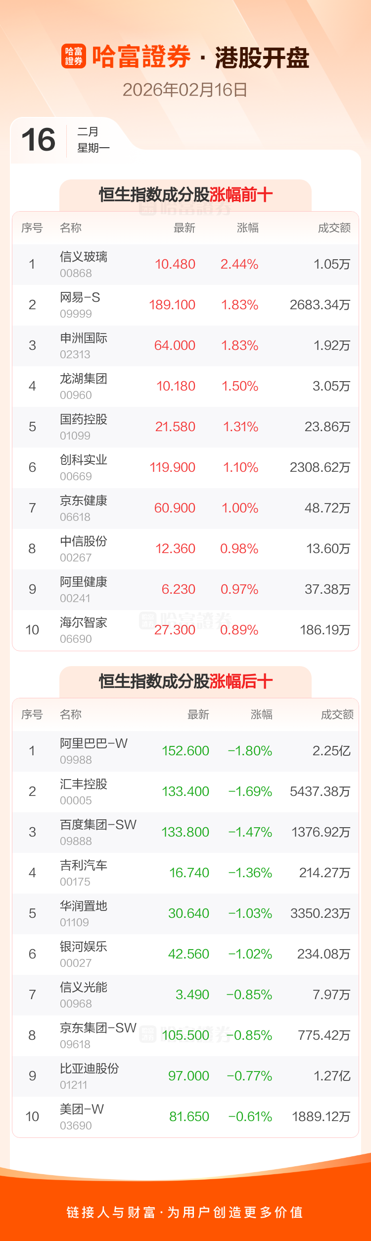 港股2月16日低开 ,恒生指数开盘报26501.2点,跌65.92点,跌幅0.25%;恒生科技指数开盘报5350.25点,跌10.17点,跌幅0.19%。恒生指数成分股中信义玻璃、网易-S、申洲国际涨幅居前,阿里巴巴-W、汇丰控股、百度集团-SW跌幅靠前。恒生科技指数成分股中腾讯音乐-SW、网易-S、零跑汽车涨幅居前,阿里巴巴-W、百度集团-SW、蔚来-SW跌幅靠前。