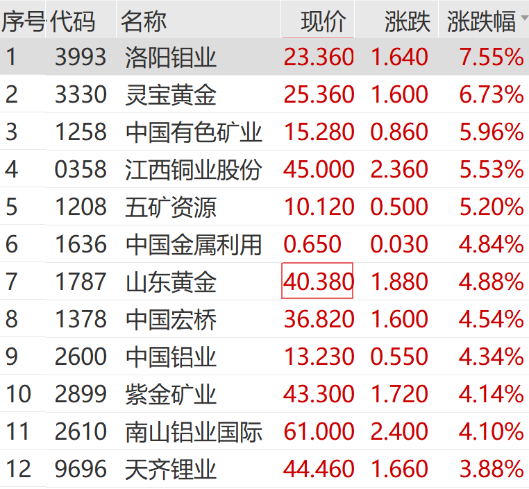 2月16日,港股有色金属板块率先走强。洛阳钼业涨超7%,灵宝黄金涨超6%,中国有色矿业、山东黄金、江西铜业股份、五矿资源等跟涨。