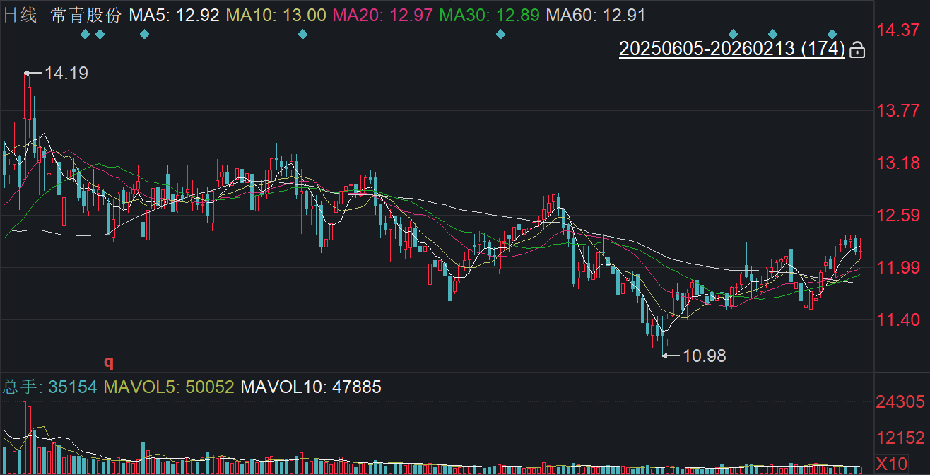 二级市场上,截至2月13日收盘,常青股份上涨0.08%报12.17元/股,总市值约28.96亿元,近一年来累计下跌约11%。