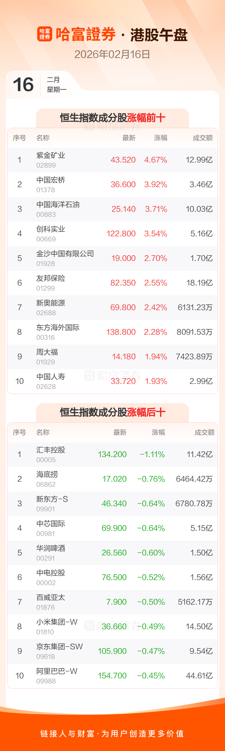 港股2月16日午盘走高,恒生指数收报26705.94点,涨138.82点,涨幅0.52%;恒生科技指数收报5367.52点,涨7.1点,涨幅0.13%。恒生指数成分股中紫金矿业、中国宏桥、中国海洋石油涨幅居前,汇丰控股、海底捞、新东方-S跌幅靠前。恒生科技指数成分股中腾讯音乐-SW、同程旅行、海尔智家涨幅居前,零跑汽车、中芯国际、小米集团-W跌幅靠前。