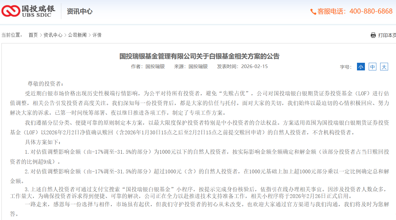 国投瑞银遵循分层分类、便捷可靠的原则制定专项工作方案,以最大限度保护投资者特别是中小投资者的合法权益。方案适用范围为国投瑞银白银期货证券投资基金(LOF)以2026年2月2日净值确认赎回(含2026年1月30日15点之后至2月2日15点之前提交赎回申请)的自然人投资者,不含机构投资者。