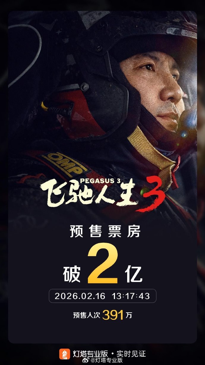 据灯塔专业版实时数据,截至2月16日13时17分,影片《飞驰人生3》预售总票房突破2亿。