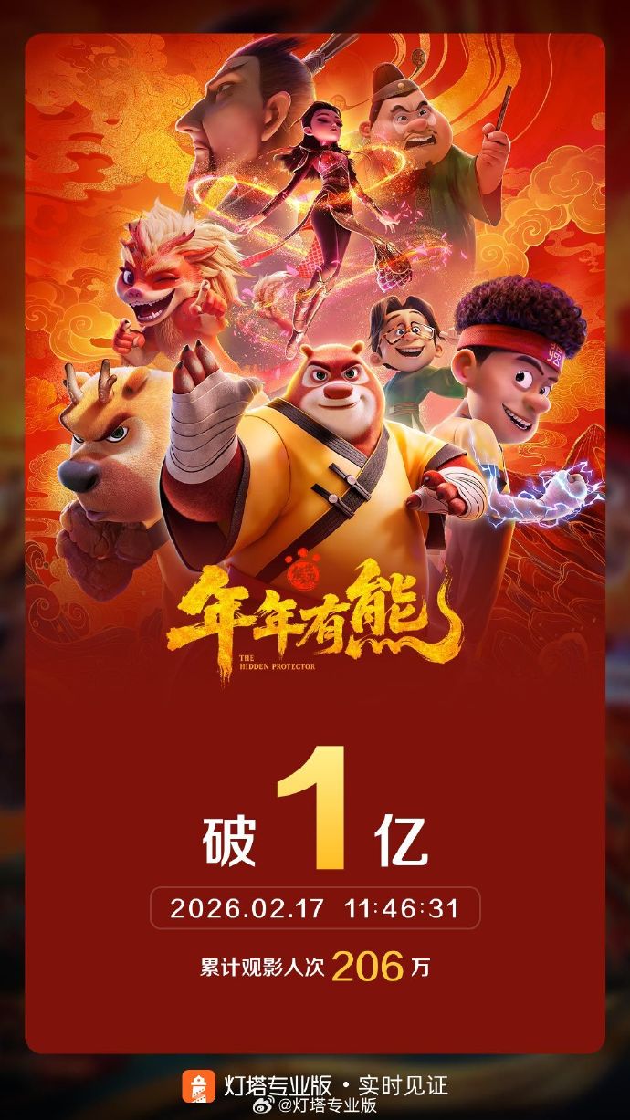 据灯塔专业版实时数据,截至2月17日11时46分,影片《熊出没·年年有熊》票房突破1亿。