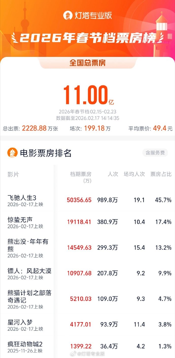 据灯塔专业版,截至2月17日14时14分,2026春节档新片总票房(含预售)突破11亿。