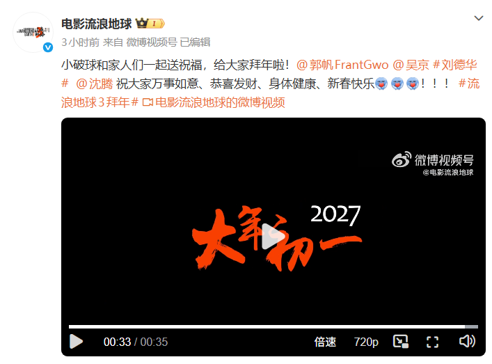 2月17日(大年初一),吴京、郭帆、刘德华、沈腾出镜给大家拜年,祝福大家新春快乐。据悉,《流浪地球3》官宣定档2027年大年初一。