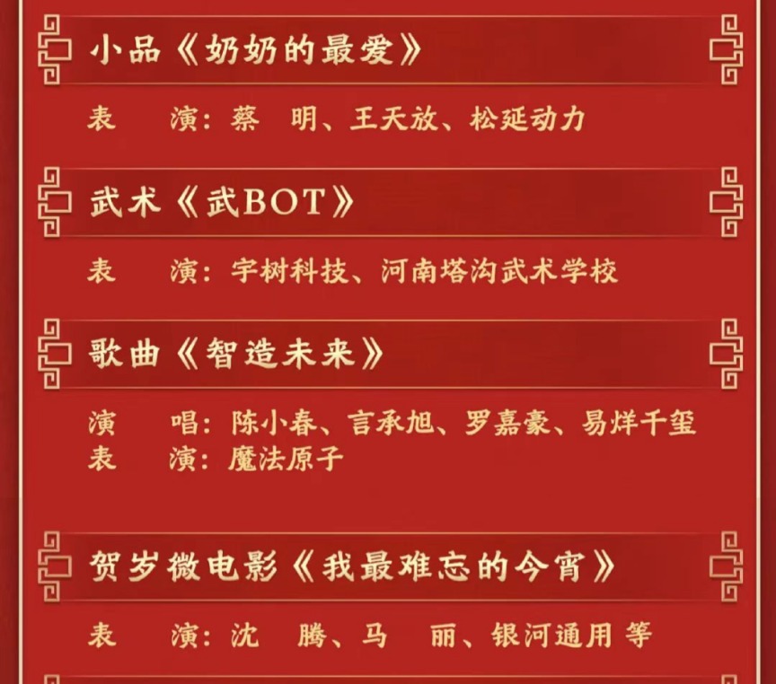 根据2026年春节节目单,松延动力、宇树科技、魔法原子和银河通用四家公司的机器人先后登场,分别参演了小品《奶奶的最爱》、武术《武BOT》、歌曲《智造未来》以及贺岁微电影《我最难忘的今宵》等表演。