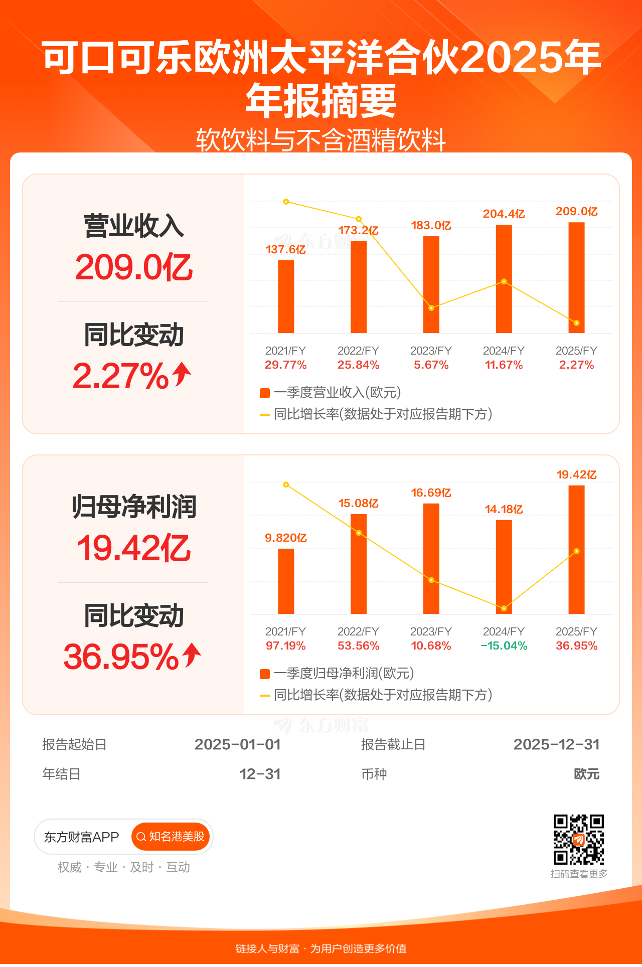 可口可乐欧洲太平洋合伙2月17日发布年报业绩,截至2025年12月31日的12个月内,该公司营业收入209.01亿欧元,同比增长2.27%;公司权益持有人应占溢利(归母净利润)19.42亿欧元,同比增长36.95%。