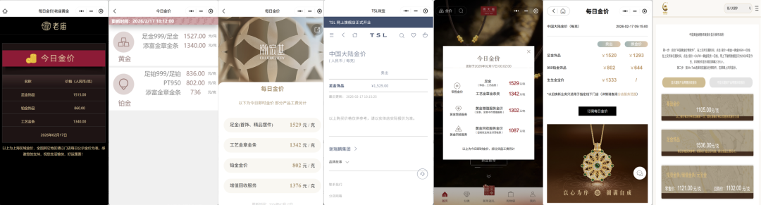 具体而言,当日,老庙黄金上海区域足金饰品价格为1515元/克;周生生足金饰品境内价格为1520元/克;六福珠宝足金999/足金境内价格为1527元/克;周大福足金(饰品、工艺品类)、谢瑞麟足金饰品、潮宏基足金(首饰摆件)境内价格为1529元/克;中国黄金足金饰品价格为1536元/克。