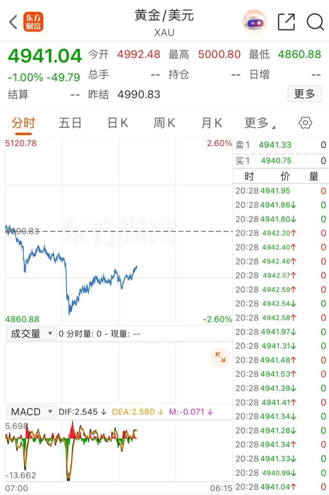 截至发稿,现货方面,现货黄金一度失守4900美元/盎司关口,最新价报4941.04美元/盎司,日内下跌1.00%;现货白银在日内多次震荡,最新价报75.06美元/盎司,日内下跌2.04%;期货方面,COMEX黄金报4958.3美元/盎司,日内下跌1.74%;COMEX白银报74.93美元/盎司,日内下跌3.89%。