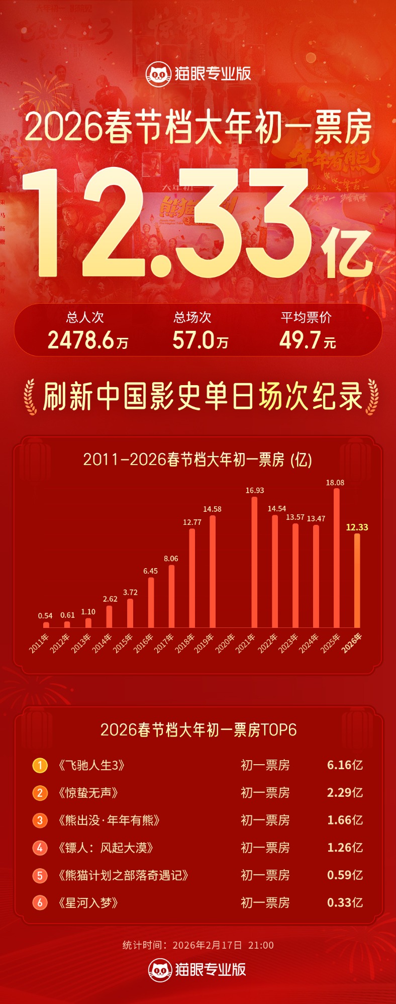 据猫眼专业版数据,截至2月17日21时,2026大年初一总票房12.33亿,《飞驰人生3》成2026年大年初一票房冠军,《惊蛰无声》《熊出没·年年有熊》分列二三位。