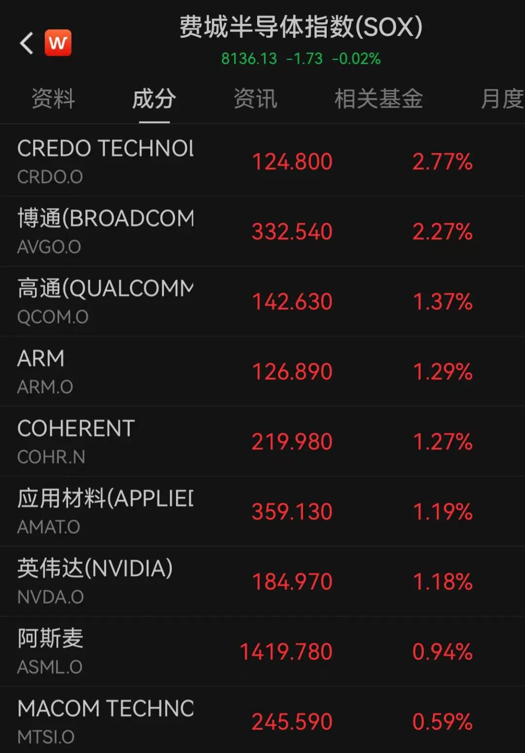 美股芯片股涨跌不一,费城半导体指数跌0.02%。个股方面,博通涨超2%,高通、ARM、应用材料涨超1%,美光科技、超威半导体跌逾2%。