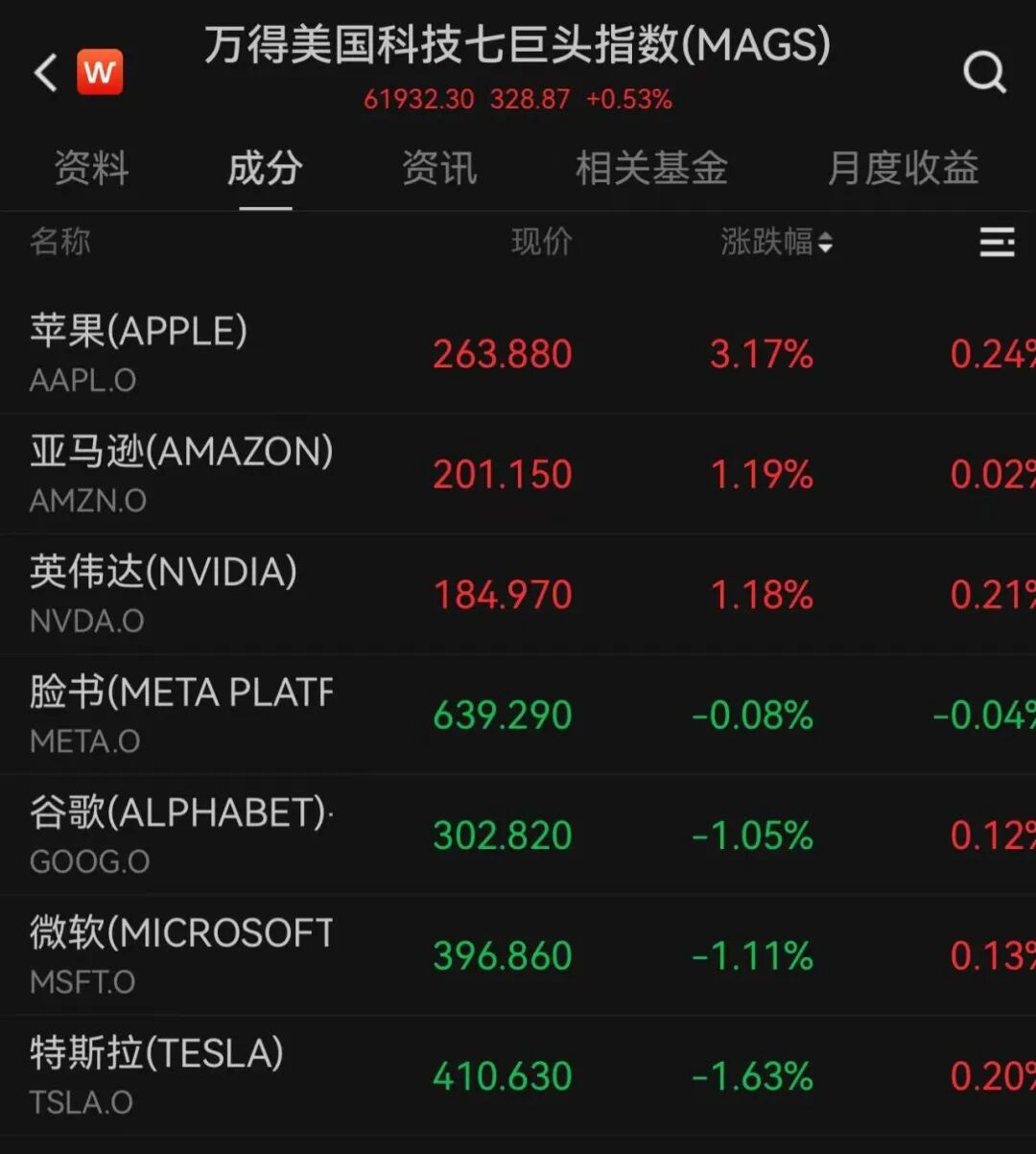美股大型科技股涨跌互现,万得美国科技七巨头指数涨0.53%。个股方面,苹果涨超3%,亚马逊、英伟达涨超1%,特斯拉、微软跌超1%。
