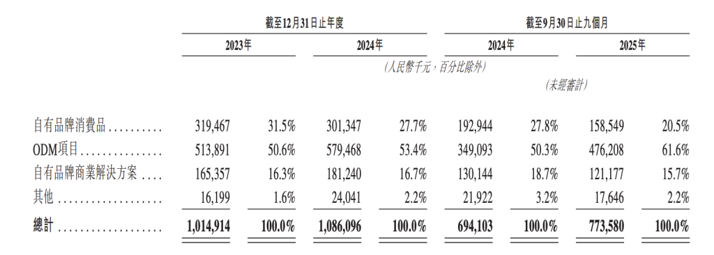 2025年前三季度,公司ODM业务收入为4.76亿元,占总收入比例从2023年的50.6%攀升至61.6%,成为绝对的收入支柱。
