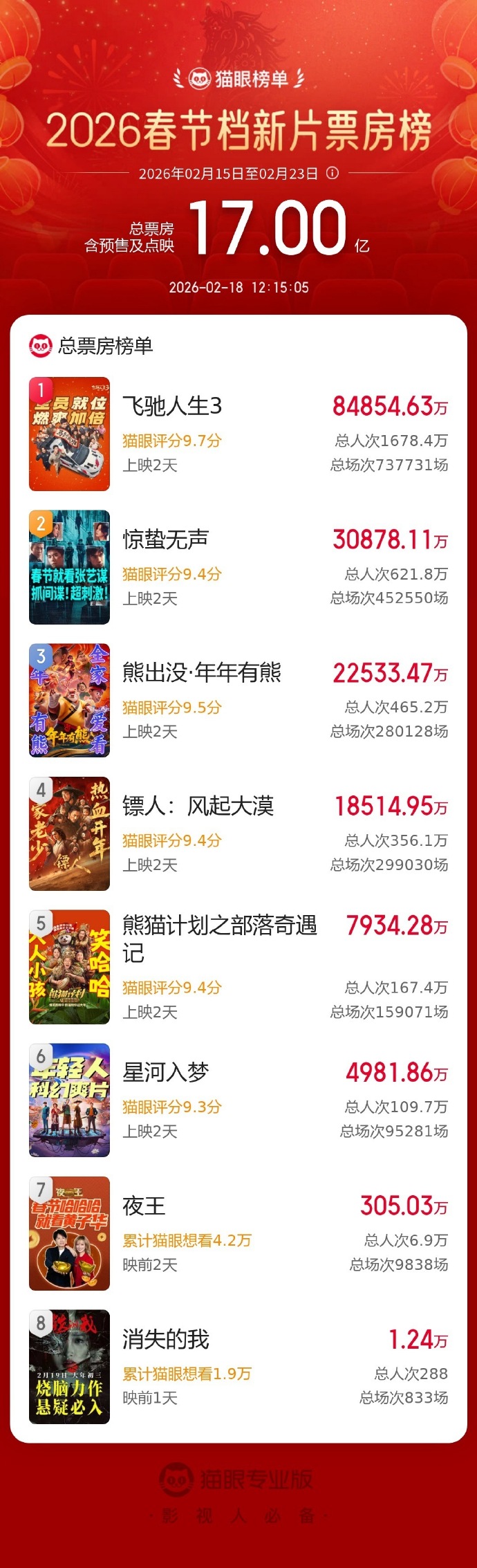 2月18日,据猫眼专业版数据,2026年春节档新片总票房破17亿元,《飞驰人生3》《惊蛰无声》《熊出没·年年有熊》暂列春节档新片票房榜前三位。