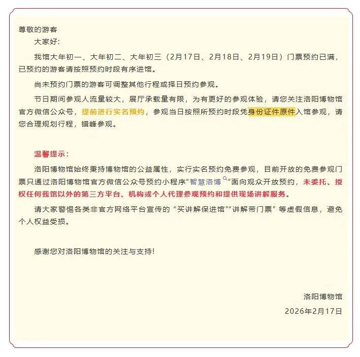 洛阳博物馆2月18日、2月19日门票预约已满,已预约的游客请按照预约时段有序进馆。尚未预约门票的游客可调整其他行程或择日预约参观。