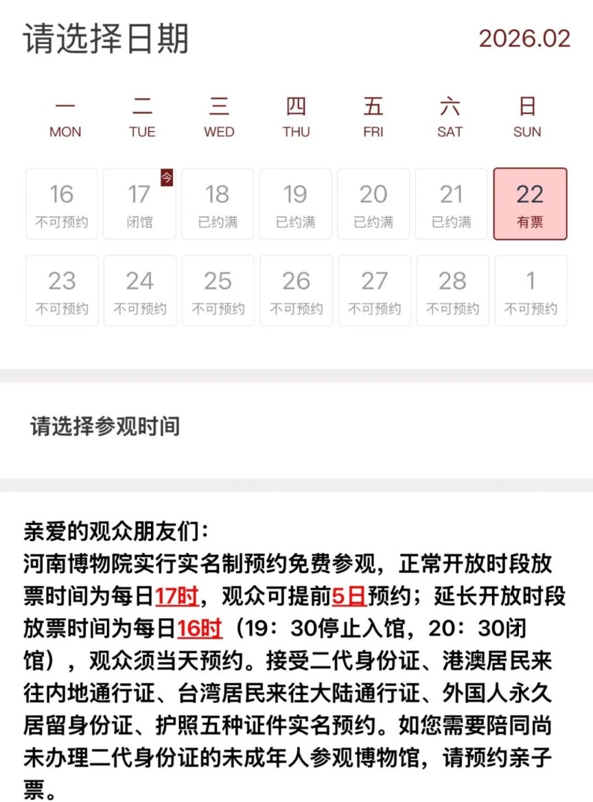河南博物院2月18日、19日、20日、21日门票预约已满。河南博物院实行实名制预约免费参观,正常开放时段放票时间为每日17时。