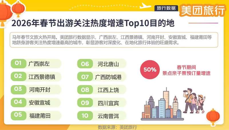 与此同时,一批文化底蕴深厚、体验独特的中小城市快速“出圈”。美团旅行数据显示,广西崇左、江西景德镇、河南开封、安徽宣城、福建莆田、河北唐山、广西防城港、江西上饶、四川宜宾、云南普洱跻身游客关注热度增速最高的城市,彰显游客对深度化、在地化旅行体验的旺盛需求。