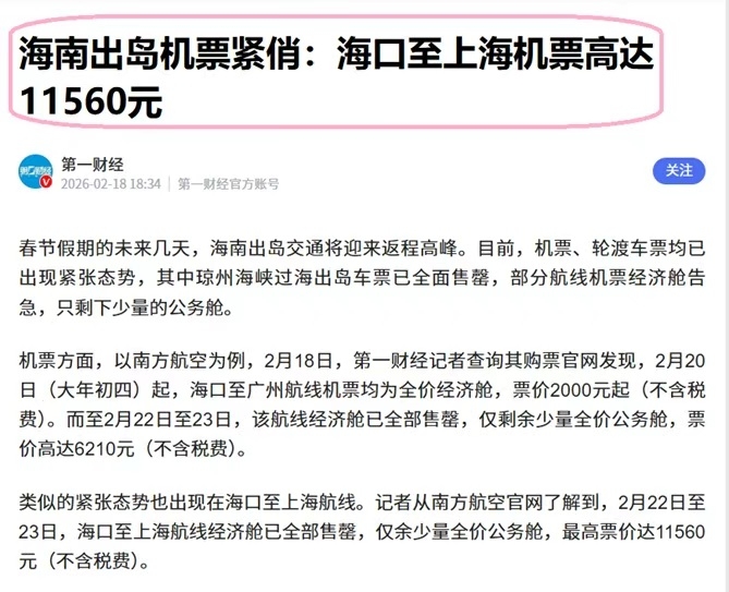 @妙想 机票方面,以南方航空为例,2月18日,第一财经记者查询其购票官网发现,2月20日(大年初四)起,海口至广州航线机票均为全价经济舱,票价2000元起(不含税费)。而至2月22日至23日,该航线经济舱已全部售罄,仅剩余少量全价公务舱,票价高达6210元(不含税费)。