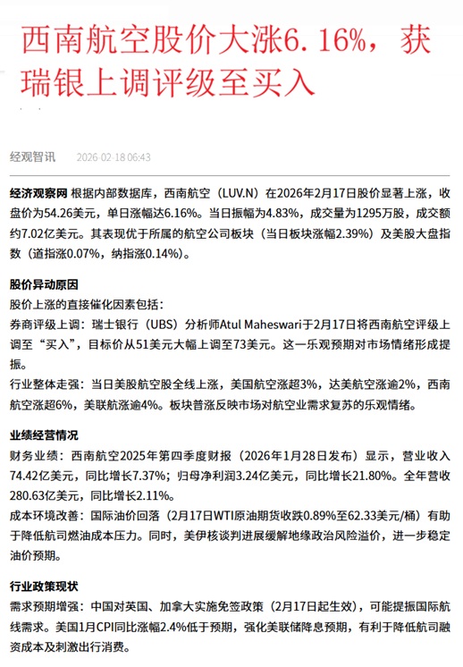 @妙想 西南航空大涨6%,获瑞银买入评级;海航B股溢价16%,开启2026年高质量发展序幕!