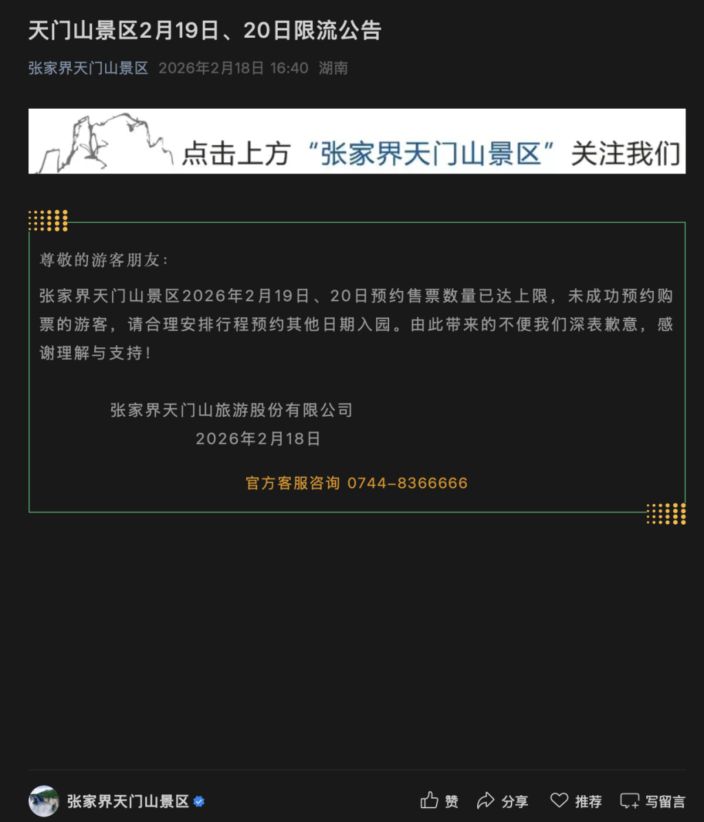 张家界天门山景区发布的公告显示,张家界天门山景区2026年2月19日、20日预约售票数量已达上限,未成功预约购票的游客,请合理安排行程预约其他日期入园。