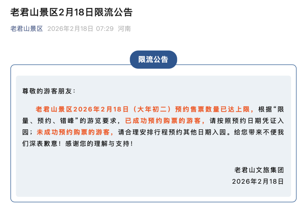 澎湃新闻发现,当日一早,老君山景区就发布公告称,老君山景区2026年2月18日(大年初二)预约售票数量已达上限。未成功预约购票的游客,请合理安排行程预约其他日期入园。