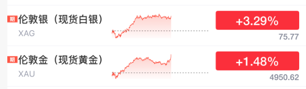 另外,黄金、白银同步大涨。