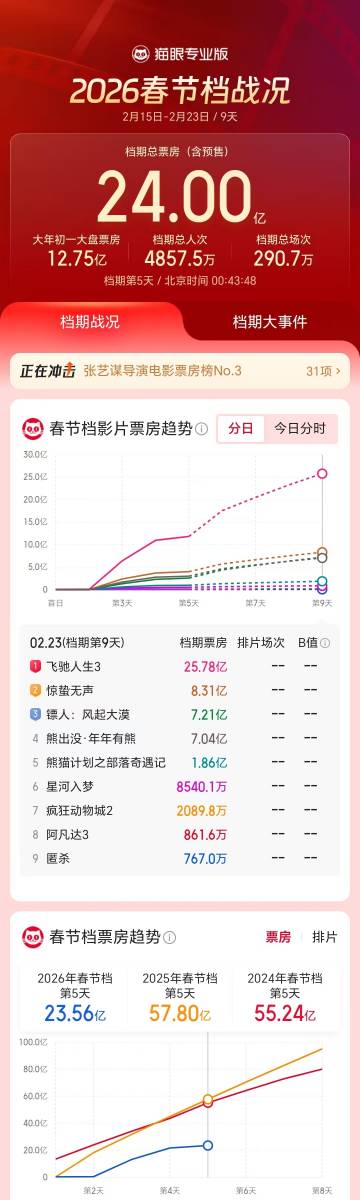 据猫眼专业版数据,2026年春节档档期总票房(含预售)破24亿,《飞驰人生3》《惊蛰无声》《熊出没·年年有熊》分列前三位。