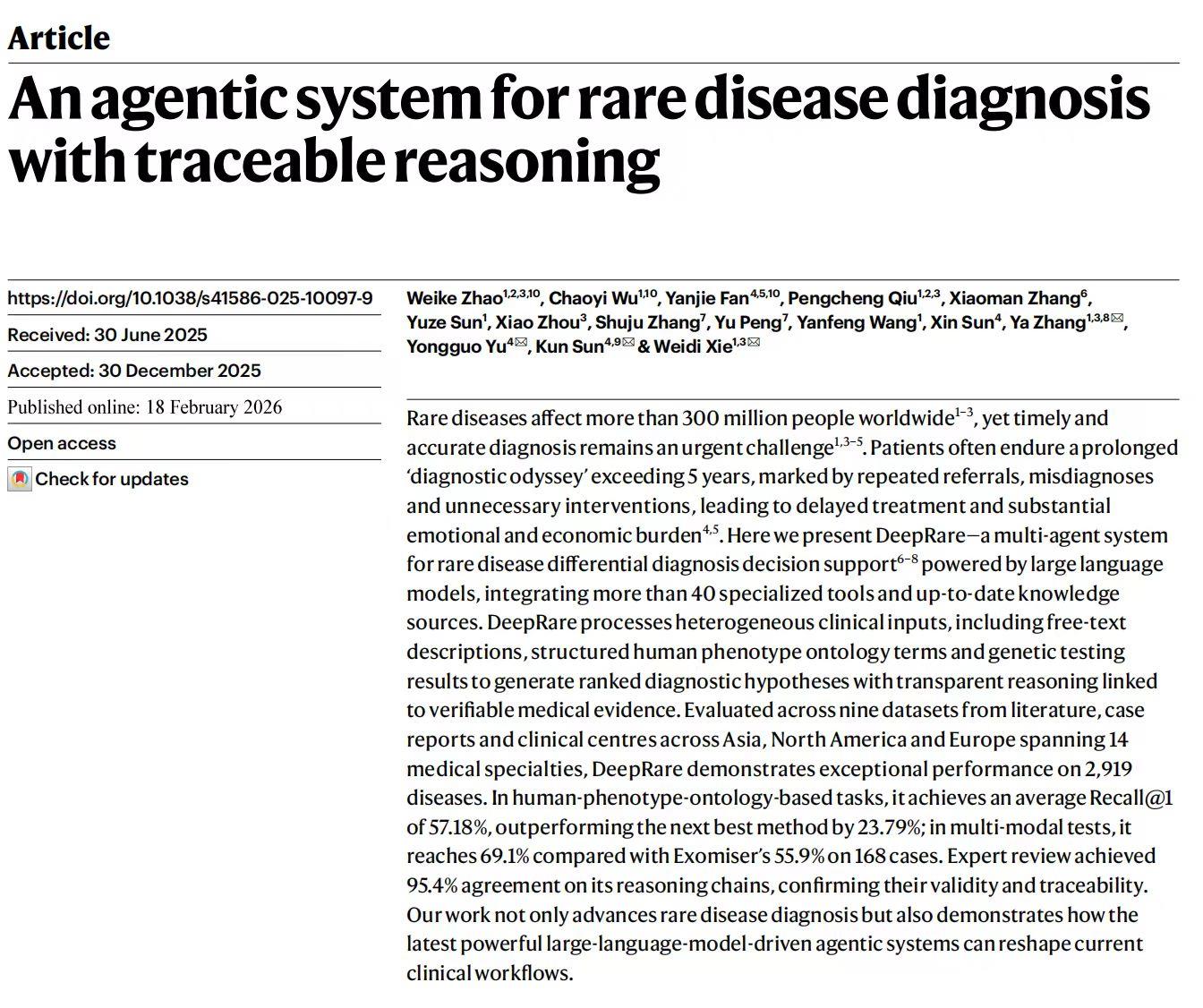 据央视新闻,2月19日凌晨,上海交通大学医学院附属新华医院孙锟教授、余永国教授领衔团队与上海交通大学张娅教授、谢伟迪副教授领衔团队联合研发出一款能看罕见病的人工智能系统,相关成果北京时间2月19日在国际顶尖期刊《自然》上发表。这套名为DeepRare的系统,被称作全球首个“推理过程可追溯”的罕见病智能医生。