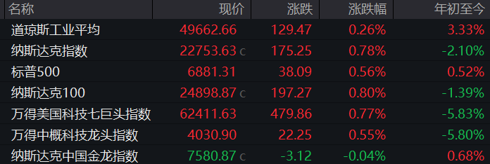 【大河财立方消息】当地时间2月18日,美股三大指数收盘全线上涨。道琼斯工业平均指数比前一交易日上涨129.47点,收于49662.66点,涨幅为0.26%;标准普尔500种股票指数上涨38.09点,收于6881.31点,涨幅为0.56%;纳斯达克综合指数上涨175.25点,收于22753.63点,涨幅为0.78%。