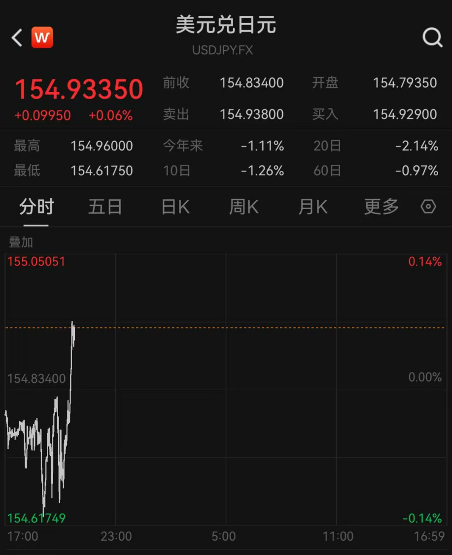 日元汇率震荡下跌,截至发稿,美元兑日元最新报154.9335。