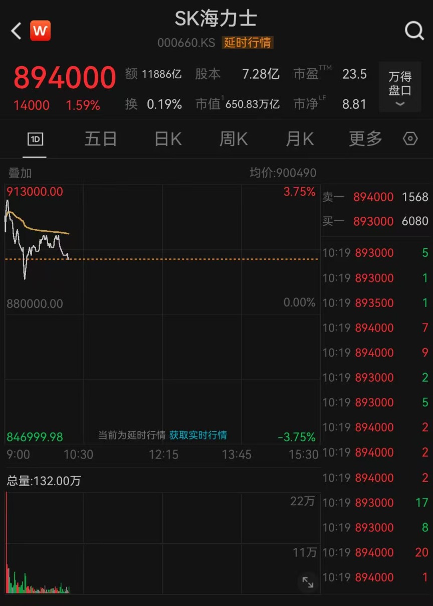 SK海力士一度涨超3.7%,截至发稿,涨幅回落至1.59%,最新市值达650.83万亿韩元。